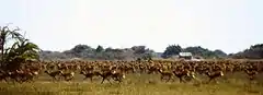 The ecosystem has Cyperus papyrus, floating grasses, miombo woodland,[5] and reeds that support large populations of crocodiles, fish, and water birds. Mammals include buffalo, Burchell's zebra, bushbuck, common tsessebe, elephants, hippopotamus, hyenas, jackals, migrating lechwe, oribi, reedbuck, roan and sable antelope, and sitatunga.[1][3][5][6] Bangweulu has the only remaining significant population of the black lechwe.[7] There were an estimated 35,000 reported in 2005, and approximately 75,000 in 2012.[3] Millions of straw-coloured fruit bats migrate to Bangweulu's Mushitu swamp forest, in Kasanka National Park.[8] In 2016, African Parks partnered with Fondation Segré to relocate 600 animals, including hartebeest, impala, and puku, into the wetlands.[9]