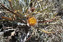 Banksia vestita, commonly known as summer dryandra,[2] is a species of shrub that is endemic to the southwest of Western Australia. It has broadly linear, pinnatifid leaves with sharply pointed teeth on both sides, yellow flowers in heads of between thirty and forty, and broadly egg-shaped follicles.