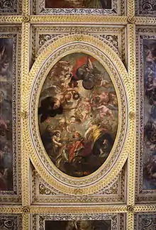 James I, for whom the Banqueting House was created, died in 1625 and was succeeded by his son, Charles I. The accession of Charles I heralded a new era in the cultural history of England. The new King was a great patron of the arts—he added to the Royal Collection and encouraged the great painters of Europe to come to England. In 1623 he visited Spain where he was impressed by Titian, Rubens, and Velázquez.[17] It became his ambition to find a comparable painter for his own court. Rubens while in England as a diplomat was asked to design and paint the Banqueting House ceiling which was sketched in London but completed at his studio in Antwerp due to the scale of the job. It was probably commissioned in 1629–30, and finally installed in 1636, the ceiling having been completely remodelled to frame the various sections. The subject, commissioned by the King, was the glorification of his father, titled The Apotheosis of James I, and was an allegory of his own birth.[18] To the King's chagrin Rubens took his knighthood and decamped back to Antwerp, leaving Anthony van Dyck, lured not only with a knighthood but also a pension and a house, to remain in England as the court painter.[18] The panels for the ceiling were all painted in Rubens' atelier in Antwerp and sent to London by ship. Inigo Jones later designed another double-cube room at Wilton House, to display Van Dyck's portraits of the aristocratic Pembroke family.