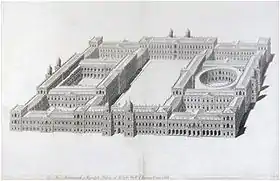 In 1638, Jones drew the designs for a new and massive palace at Whitehall in which his banqueting house was to be incorporated as one wing enclosing a series of seven courtyards, visible on the monumental main façade as only a small flanking wing. These revealed the ideas behind Jones' concept of Palladianism. However, King Charles I, who commissioned the plans, never amassed the resources to execute them;[12] his lack of funds and the tensions that eventually led to the Civil War intervened and the plans were permanently shelved.