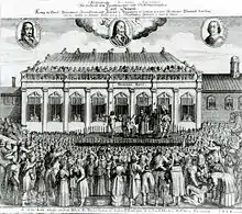 Given the attention and effort which were lavished by Charles I on the Banqueting House, his end was not without irony. On the afternoon of 30 January 1649 he stepped out of a first floor window of Banqueting House onto the scaffold which had been erected outside for the purpose of his own execution.[19] The actual window no longer exists as it was not in the main hall but just outside it in an adjacent part of the building which has now gone and, pictured from the outside, would have been the next window along at the north end, roughly above the current visitors' entrance.[20]