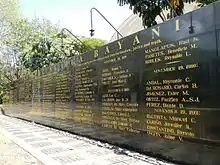 The central element of the Bantayog memorial is the granite "Wall of Remembrance" on which are inscribed the names of the martyrs and heroes who the abuses of the Marcos dictatorship.[3]