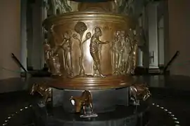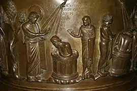 The basin is 91 centimetres (36 in) across at the top, tapering slightly towards the base, and is variously described as of brass or bronze.[21] It was made by lost wax casting, with the basin cast in a single piece; the size was not necessarily exceptional, as both church bells and cauldrons for large households were probably cast at comparable sizes; some church doors cast in a single piece, though flat, were much larger. The font sat on twelve oxen (two are now missing), who emerged from a stone plinth, a reference to the "molten sea... on twelve oxen" cast in bronze for Solomon's temple[22] The five scenes shown, identified by Latin inscriptions ("tituli") on the rim above and in the image field, can be read in chronological sequence:[23][24]