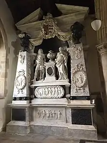 On his death in 1682, he was buried in the church of St Peter and St Paul, Exton. His grave is marked by a fine marble tomb by Grinling Gibbons, dating from 1685, showing the Viscount with his fourth wife, Lady Elizabeth Bertie, and carvings of his 19 children.[4]