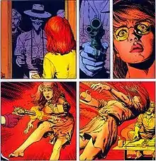 Barbara Gordon, as both Batgirl and Oracle, has made several appearances in Elseworlds comics since 1997. The Elseworlds imprint takes the company's iconic characters and places them in alternate timelines, places and events making heroes "as familiar as yesterday seem as fresh as tomorrow."[103] The character is given starring roles in the noir-style storyline Thrillkiller: Batgirl & Robin (1997),[104] its sequel Batgirl + Batman: Thrillkiller '62 (1998),[105] and the one-shot comic Elseworld's Finest: Supergirl & Batgirl (1998),[106] all of which depict worlds where Barbara is Gotham's first bat-themed hero (Bruce Wayne is a police detective who becomes Batman in the 1960s-set Thrillkiller series, and merely serves as essentially her 'Alfred' in Elseworld's Finest in a timeline where Jim Gordon was killed rather than the Waynes).