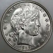 All three denominations of the Barber coinage depict a head of Liberty, facing right. She wears a pileus, a crown fashioned from an olive branch, and a small headband inscribed "Liberty". On the quarter and half dollar, the motto "In God We Trust" appears above her head; she is otherwise surrounded with 13 six-pointed stars and the date. On the dime, her head is surrounded with "United States of America" and the year. The reverse of the quarter and the half dollar depicts a heraldic eagle, based on the Great Seal. The bird holds in its mouth a scroll inscribed "E Pluribus Unum" and in its right claws an olive branch; in its left it holds 13 arrows. Above the eagle are 13 five-pointed stars; it is surrounded by the name of the country and by the coin's denomination.[31] The reverse of the dime depicts a wreath of corn, wheat, maple and oak leaves surrounding the words "One Dime".[29] Barber's monogram "B" is on the cutoff of Liberty's neck; the mint mark, on the dime, is placed beneath the wreath on the reverse[32] and beneath the eagle on the larger denominations.[33]