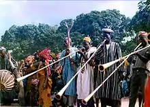 The Gbangba, danced by young Wasangari aged between 18 and 25, is identified by its solemn, mournful rhythm. It was for-merly used to announce the death of a king and to accompany the preparations for burial ceremonies. A war dance, it also an-nounces the start of a conflict. The Fulbe carry out the Sinna which imitates flagellation, and the Gesegesere.