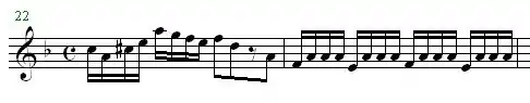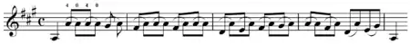 In the following example, from a violin sonata by Handel,[lower-alpha 1] the second measure is to be played with bariolage. The repeated A is played on the open A string, alternating with Fs and Es fingered on the adjacent D string.