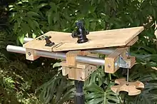 A simple single-arm barn door tracker can be made by attaching two pieces of wood together with a hinge. A camera is mounted on the top board, usually with some sort of ball joint to allow the camera to be pointed in any direction. The hinge is aligned with a celestial pole and the boards are then driven apart (or together) at a constant rate, usually by turning a threaded rod or bolt. This is called a tangent drive.
