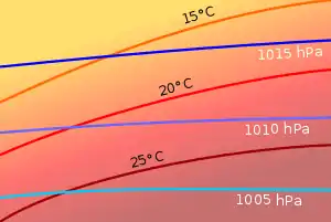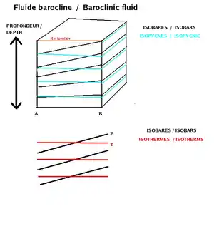 which is proportional to the sine of the angle between surfaces of constant pressure and surfaces of constant density. Thus, in a barotropic fluid (which is defined by zero baroclinity), these surfaces are parallel.[4][5][6]