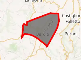 Barolo is a comune (municipality) in the Province of Cuneo in the Italian region Piedmont, located about 50 kilometres (31 mi) southeast of Turin and about 40 kilometres (25 mi) northeast of Cuneo. As of 30 April 2009 it had a population of 750 and an area of 5.6 square kilometres (2.2 sq mi).[3]