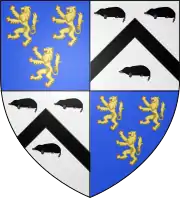 ![]() ![]() Quarterly, 1st & 4th: Azure three lions rampant or (for Fiennes); 2nd & 3rd: Argent, a chevron between three moles sable (for Twisleton) | |