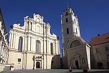 A notable style of Baroque architecture emerged in the 18th century with the work of Johann Christoph Glaubitz, who was assigned to rebuild the Grand Duchy of Lithuania's capital of Vilnius. The style was therefore named Vilnian Baroque, and Old Vilnius was named the "City of Baroque".[5] The most notable buildings by Glaubitz in Vilnius are the Church of St. Catherine started in 1743,[6] the Church of the Ascension started in 1750, the Church of St. John, the monastery gate and the towers of the Church of the Holy Trinity. The magnificent and dynamic Baroque facade of the formerly Gothic Church of St. Johns is mentioned among his best works. Many church interiors including the one of the Great Synagogue of Vilna were reconstructed by Glaubitz as well as the Town Hall built in 1769. The best example of Vilnian Baroque in other places is the Saint Sophia Cathedral in Polotsk, which was reconstructed between 1738 and 1765.