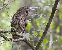 The habitat used by barred owl is largely old deciduous, mixed forests and, occasionally, coniferous forests.[3] Old growth forests are preferred due to more extensive potential nest sites, less lower branch density to impede hunting (and perhaps superior structural complexity to aid hunting), greater security from mobbing and perhaps greater thermoregulation.[121][122][123][124] They are often found in bottomland hardwood forests in the largest swath of the native breeding range, often (particularly from Virginia south and west) with deep, dark stands of oak, gum and cypress.[8][125] Secondary habitat, often used during foraging forays in the south, are often oak savanna or cabbage-palm areas.[8] Regardless of area, some variety of water is frequently present, including riparian areas or swampy ground.[3][56][126] Closed canopy forests were preferred in a study from Oklahoma (62.8% of habitat used), followed by fallow agricultural fields (10.6%), wetlands (8.1%) and open terrain (6.2%). The latter three were visited during hunting forays, and wetlands and open terrain areas were not used outside of the breeding season.[127] Along the Atlantic coast area from New England to New Jersey, barred owls are often found in mixed swamps areas with cedars, seldom wandering to adjacent wetlands or farmland.[128][129] The species may be at home in wooded areas in mountainous regions.[3] More upland wooded habitats, often in mixed woods containing hemlock, alder, poplar, pine and oak, are typical in the northern part of the range.[37][126] A study in northern New Jersey found at least 15 species of both conifer and deciduous trees were routinely used for differing purposes.[130] In Michigan, barred owl habitat usually consists largely of some combination of hemlock and maple trees, with mixed forest usage being use disproportionately to its prevalence in the environment.[131] Large oak stands were preferred in Minnesota, a bit ahead of mixed forest and far ahead of white cedar swamps and other habitat types, which were either too dense, too open or had too few attractive nesting sites.[121][132]