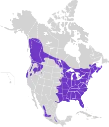 The barred owl is distributed throughout most of the eastern United States, as well as much of southern Canada.[3] They are found as far northeast as much of Nova Scotia (western two-thirds), New Brunswick and Sept-Îles, in much of Quebec, up to Lake Mistassini, and Ontario, up to Moosonee.[1][73][74][75][76] The barred owl has been recorded as ended up as far north as central Labrador, though the species is not yet confirmed to breed in the province.[77] The barred owl ranges in every part of the eastern United States continuously from northernmost Maine down throughout New England, the Mid-Atlantic states, much of the Midwest, the Southeast United States and all of Florida.[1][34] They are found to as far east without substantial gaps to the limits of western Minnesota, easternmost South Dakota, the southeastern corner of Nebraska, the eastern half roughly of Kansas, most of Oklahoma and east Texas to as far west as Cisco and Burnet.[1][78][79][80][81] Arguably and discontinuously from Texas, the species may range into central and southern Mexico but these populations are now often considered a separate species.[1][82] These initial parts of the range in the eastern and central stretches would be considered as where the species is “native”.[6][83] A wandering barred owl was once seen flying over Lake Michigan 48 km (30 mi) from the nearest land.[84]
