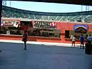 The hype surrounding Bonds's pursuit of the home run record escalated on May 14. On this day, Sports Auction for Heritage (a Dallas-based auction house) offered US$1 million to the fan who would catch Bonds's record-breaking 756th-career home run.[117] The million dollar offer was rescinded on June 11 out of concern of fan safety.[118] Home run 748 came on Father's Day, June 17, in the final game of a 3-game road series against the Boston Red Sox at Fenway Park, where Bonds had never previously played.[119] With this homer, Fenway Park became the 36th major league ballpark in which Bonds had hit a home run. He hit a Tim Wakefield knuckleball just over the low fence into the Giant's bullpen in right field. It was his first home run off his former Pittsburgh Pirate teammate, who became the 441st different pitcher to surrender a four-bagger to Bonds. The 750th career home run, hit on June 29, also came off a former teammate: Liván Hernández.[120] The blast came in the 8th inning and at that point tied the game at 3–3.
