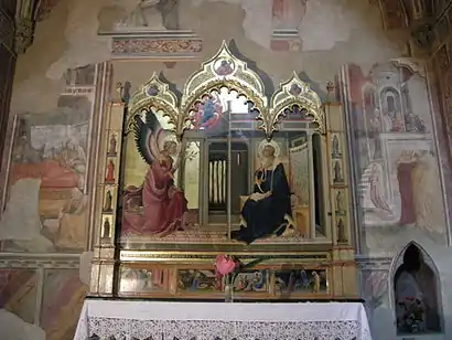 The panel follows the same stylistic and narrative pattern as the other frescoes in the chapel, also by Lorenzo Monaco. It shows the Annunciation and, in the predella, other episodes of the Life of the Virgin which do not feature in the frescoes.