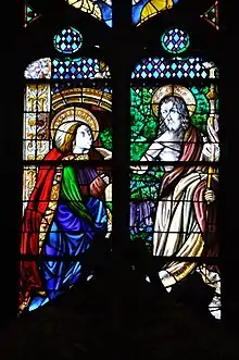Whether or not he briefly returned to Valencia, Bermejo's later years were spent in Barcelona, where he first worked on the High Altar Retable for the convent church of Santa Anna (carpentry contract,1485) the surviving panels from this retable were destroyed in 1936, but old photographs suggest the intervention of a second, later hand, opening up the possibility that he did not finish this work either.[9] Here, he completed his masterwork for Canon Lluís Desplà i Oms' private chapel, the Pietà in 1490, which contains the donor's portrait. Other documents in Barcelona concern designs for stained-glass windows. the Noli Me Tangere for the baptismal chapel of Barcelona Cathedral (1495) and two windows representing the virtues Faith and Hope for the Llotja of Barcelona in 1500 and 1501 (now destroyed).[10] It is a testament to his skills and talent that though Barcelona was in a severe economic depression at this period, Bermejo continued to receive commissions from both its Cathedral Chapter and the municipal government.