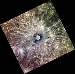 Bashō is a crater on Mercury named after Matsuo Bashō, a 17th-century Japanese writer.[1] Bashō crater is only 74.62 kilometers (46.37 mi) in diameter,[2] but is a prominent feature on Mercury's surface, due to its bright rays. Photographs from NASA's Mariner 10 and MESSENGER spacecraft show a curious halo of dark material around the crater.[3]