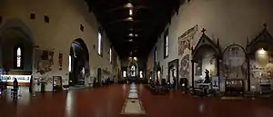 At the chancel entrance is suspended a very large painted rood crucifix by one Master of San Francesco, a contemporary of Cimabue. It also contains a Maesta or "Madonna in Majesty" by Guido da Siena.