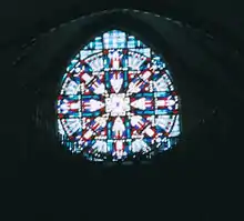 The church has 64 large cathedral glass windows.[2] There are two notable windows in the church. The first is the rose window above the entrances to the church, installed in 1959. It replaced a conventional church window on which the framework had become deteriorated. An Indian motif was selected in recognition of many local Indian tribes that inhabited this area 150 years earlier.