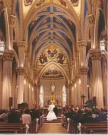 The frescoes adorning the walls and the ceilings of the nave were painted by Vatican painter and artist in residence Luigi Gregori.[23] The ceilings are filled with a starry sky with angels, while the walls and transept are decorated with figures of saints. Each of the 12 bays of the vaulted veilinceuling is decorated with an angel, for a total of 96 painted angels. Gregori also painted the stations of the Cross that decorate the walls of the main nave. The neogothic style of the frescoes is similar to that of Santa Maria sopra Minerva, which was done by Bernardino Riccardi, Pietro Gagliardi, Tommaso Greggia, and Raffaele Casnédi in the mid 1800s. This style was inspired by Italian gothic decorations, such as the Basilica of Saint Francis of Assisi or the Scrovegni Chapel.