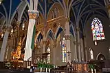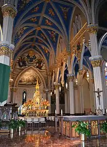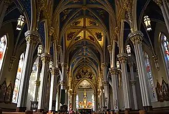 The Basilica of the Sacred Heart in Notre Dame, Indiana, USA, is a Roman Catholic church on the campus of the University of Notre Dame, also serving as the mother church of the Congregation of Holy Cross (C.S.C.) in the United States. The neo-gothic church has 44 large stained glass windows and murals completed over a 17-year period by the Vatican painter Luigi Gregori. The basilica bell tower is 230 feet (70 m) high, making it the tallest University chapel in America.[5][6] It is a contributing building in Notre Dame's historic district listed on the National Register of Historic Places.[7] The Basilica is a major tourist attraction in Northern Indiana, and is visited annually by more than 50,000 tourists. [8]