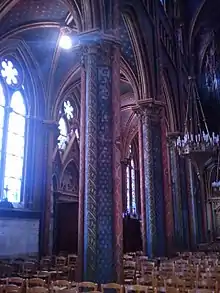 The extensive and coordinated decorations were part of a revival of religious art under the July Monarchy and include murals, sculpture, stained glass windows and liturgical furnishings.[2] All the interior surfaces of the basilica are painted, as with Sainte-Chapelle. There are three chapels, dedicated respectively to Mary, Saint Joseph, and Saints Theresa and Joan of Arc.[9] The batismal font is set in a hexagonal marble structure created in Rouen in 1891. The main altar is gilded bronze, made from chiseled metal to a design by Barthélemy.[9] A new altar was installed in the sanctuary in April 2006 made by Dominique Kaeppelin, sculptor at the Puy-en-Velay workshop. The stalls were made by the Maison Kreyenbielh of Paris and installed in 1858. There are four confessionals, made by Père Cahier.[9] The well-known glass artist Henri Gerente installed five windows in the apse in 1842. Two of them are still in place.[10]