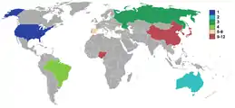 | Rank | World | Africa | Americas | Asia | Europe | Oceania |