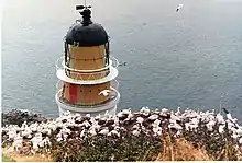 The Bass Rock Lighthouse on Bass Rock is a 20-metre (66 ft) lighthouse, built in 1902 by David Stevenson, who demolished the 13th-century keep, or governor's house, and some other buildings within the castle for the stone. The commissioners of the Northern Lighthouse Board decided that a lighthouse should be erected on the Bass Rock in July 1897 along with another light at Barns Ness near Dunbar. The cost of constructing the Bass Rock light was £8,087, a light first being shone from the rock on the evening of 1 November 1902. It has been unmanned since 1988 and is remotely monitored from the board's headquarters in Edinburgh. Until the automation the lighthouse was lit by incandescent gas obtained from vaporised paraffin oil converted into a bunsen gas for heating a mantle. Since that time a new biform ML300 synchronised bifilament 20-watt electric lamp has been used.[2]