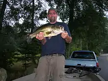 All black bass are well known as strong fighters and are fished recreationally. Depending upon species and various other factors such as water quality and availability of food, black bass may be found in lakes, reservoirs, ponds, rivers, streams, creeks, and even roadside ditches.[1] Largemouth are known for their greater overall size. Largemouth also tend to jump more than other black bass and fight aggressively near the surface. However, smallmouth bass tend to fight even more aggressively when hooked, favoring extremely powerful runs to underwater structures such as submerged logs, weed beds, and rock piles.[5] The All-Tackle world record Black Bass was a largemouth that was caught on June 2, 1932, on Montgomery Lake, GA by George Perry, weighing in at 22 lbs. 4 oz. George Perry's record fish, which some consider the “Holy Grail” of all freshwater sport fishing records, was finally challenged by Japanese angler Manabu Kurita on July 22, 2009. Kurita's catch was officially certified by the IGFA, weighing 22 lbs. 4 oz, the same weight as Perry's legendary catch. There are also several stories of fish that may have exceeded this record weight, but only these two were officially certified. Perry and Kurita have shared the All-Take world record since 2009.[6]