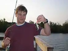 Bass fishing is the activity of angling for the North American gamefish known colloquially as the black bass.[1] There are numerous black bass species considered as gamefish in North America, including largemouth bass (Micropterus salmoides), smallmouth bass (Micropterus dolomieui), spotted bass or Kentucky bass (Micropterus punctulatus), and Guadalupe bass (Micropterus treculii).[2] Black bass are members of the sunfish family, Centrarchidae.