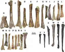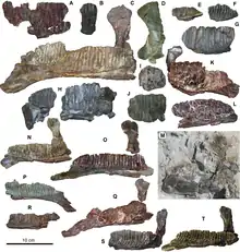 An intertwined subject to the taxonomy which has been noted and studied has been the size and ontogeny (growth and development) of the individuals represented. Individuals of multiple sizes are represented in the sample, but overall they represent smaller animals than the hadrosaurs known from Asia and North America. Despite this, a small number of individuals falling into the adult size ranges of other hadrosaurs are indicated by isolated elements, such as femurs.[1][2] Multiple hypotheses have been put forward to explain this: firstly, juvenile individuals may have been the dominant life stage living in the area where the bonebed was preserved, due to ecological differences over lifespan; secondly, it's possible they represent dwarfed animals dominating the environment relative to rare a larger species; lastly, it's possible the large individuals were comparative giants of a single dwarfed species, near the extreme end of individual variation in the species.[2] The 2015 analysis of hadrosaur dentaries from the Pyrenees found two morphotypes to be present in the bonebed, so they favored the second hypothesis.[4]