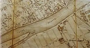 The spot depicted is just short of four miles from the centre of Paris. In fact, the figures on the river-bank are not in the commune of Asnières, but in Courbevoie, the commune bordering Asnières to the west. The bathers are in the River Seine. The slope forming most of the left hand side of the painting was known as the Côte des Ajoux, near the end of the rue des Ajoux, on the north bank of the river. Opposite is the island of la Grande Jatte, the east tip of which is shown as the slope and the trees to the right, and which Seurat has pictorially extended beyond its actual length. The Asnières railway bridge and the industrial buildings of Clichy are in the background. Locations such as this one were sometimes shown on French nineteenth century maps as Baignade (or, ‘bathing area’).[2][3]