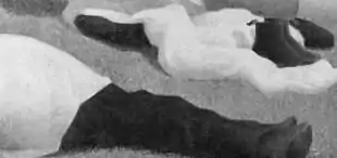 X-ray imaging of the Bathers has revealed that some components of the composition were altered as Seurat’s work on the canvas progressed, while other components were probably not in the painting at all, as he first painted it. The two reclining figures—one at the front of the image, the other with the straw hat toward the rear—are revealed by the X-ray image to have been among the later concerns for Seurat. The reclining man at the front has had the position of his legs moved to a position more horizontal than that in which they were when first painted. The reclining figure toward the rear is not visible in the X-ray image at all, showing he is a late addition. His posture reflects the altered position of the man in the foreground, raising the suggestion that he was painted in as a compositional response to the alteration made to the man at the front. The skiff and the ferry boat with the tricolor, and the pointillistically applied spots at various locations in the lower mid-section of the painting, are also absent in the X-ray image. A contentious theory suggests that these elements were added by Seurat as a means of making a connection between the Bathers and A Sunday Afternoon on the Island of La Grande Jatte. In spite of their remoteness in the middle distance, the motifs and the seated figures on the boat are present in the later painting, and the ferry boat indeed traverses the river between the Courbevoie river-bank and the île de la Grande Jatte itself. The late additions in Bathers bring for the first time a note of vitality to the serene picture in keeping with the more "sociable" climate of A Sunday Afternoon on the Island of La Grande Jatte.[41]