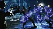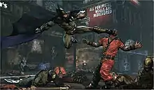 Using an improved version of the "Freeflow" combat system from Arkham Asylum, the player can now counter multiple blows simultaneously, catch hurled projectiles, attack aerially, and administer a succession of consecutive strikes. Many of Batman's gadgets can now be used in combat.[17] Enemies are armed with varying levels of armor and weapons; attacks from basic weapons like baseball bats and lead pipes inflict minor damage and can be countered, while guns inflict significant damage. Certain enemies must be disarmed in specific ways before they can be neutralized in combat: enemies with stun batons can only be attacked from behind; enemies with shields require aerial attacks to disarm; and enemies wearing body armor must be stunned with rapid successive strikes before they can be harmed.[20][21] Larger enemies must be tackled with stuns and combo attacks, and can be manipulated to take out their allies.[22] Disputes between gangs allied to rival villains often spark turf wars, which complicate the player's ability to move about Arkham City.[17] Combat, among other actions, rewards the player with experience points that allow the player to periodically level Batman up and purchase upgrades to his Batsuit, gadgets, and combat and stealth skills. Each category contains approximately 15 different upgrades. For instance, an upgraded grapnel gun can be used to remotely disarm enemies, while a combat upgrade makes it easier to activate special attacks.[23][24]