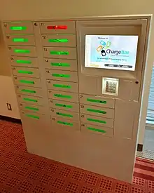 A pedal powered charger for mobile phones, fitted into desks has been created by a Belgian company WeWatt, for installation in public spaces, such as at airports, railway stations and universities have been installed in a number of countries on several continents.[9]