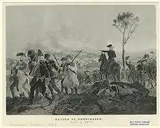 The battle forces are generally described as in Morrissey.[5][44] His numbers are generally consistent with other sources on the British units, although there is disagreement across a wide array of sources on the number of troops under Breymann, which are generally listed at either approximately 550 or 650.[4][2] Morrissey is also incorrect in identifying some of the American units. He identifies William Gregg as having a separate command; Gregg apparently led several companies in Nichols' regiment.[45] Morrissey also failed to include the Massachusetts militia,[46] and misidentified Langdon's company, erroneously believing they may have been from Worcester, Massachusetts.[47] (Militia companies from the Worcester area marched on Bennington, with some companies arriving the day after the battle.)[48] Langdon originally raised his company in 1776, but it did not become a cavalry unit until 1778.[49]