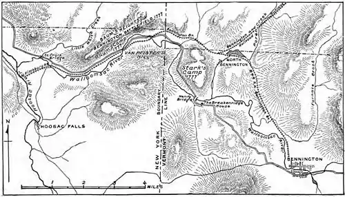 Baum's Germans left Burgoyne's camp at Fort Edward on August 9 and marched to Fort Miller, where they waited until they were joined by the Indians and a company of British marksmen. The company marched off toward Bennington on August 11.[23] In minor skirmishes along the way they learned from prisoners taken that a sizable force was in place at Bennington.[24] On August 14 Baum's men encountered a detachment of Stark's men that had been sent out to investigate reports of Indians in the area. Stark's men retreated, destroying a bridge to delay Baum's advance. Stark, on receiving word of the approaching force, sent a request to Manchester for support, and then moved his troops out of Bennington toward Baum's force, setting up a defensive line.[4] Baum sent a message to Burgoyne following the first contact indicating that the American force was larger than expected, but that it was likely to retreat before him. He then advanced a few miles further until he neared Stark's position. He then realized that at least part of his first message was incorrect, so he sent a second message to Burgoyne, requesting reinforcements.[25]