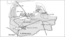 According to the Winograd report there were ground battles in Bint Jbeil during Operation Change of Direction 8 (1–3 August) but it gives no details.[63] There are no other reports confirming any serious fighting in Bint Jbeil, or of any Israeli casualties, during this period. Lebanese sources claim that "what appeared to be a truce" [hudna] was observed from 29 July until 7 August, when Operation Change of Direction 10 was launched.[6]