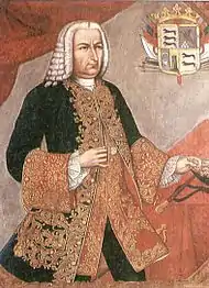 The Spanish force defending Cartagena was composed of 2,700 to 3,000 Spanish regulars[61] from the regiments Aragon, España and that of Toledo, Lisboa and Navarra just arrived in October 1740, brought by Vice-admiral Torres; a colonial regiment from Cartagena; an unspecified number of sailors; 5 companies of militia and 600 Indian archers, perhaps 4,000[62] to 6,000 defenders,[63] manning six ships of the line and strategic fortifications—under the command of the Governor General of Cartagena, Don Blas de Lezo and the Viceroy of New Granada, Sebastián de Eslava.