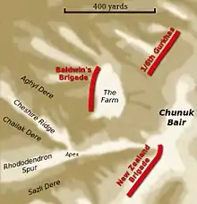 This force would climb to Hill Q from the Farm. At the same time, the New Zealanders on the right from Chunuk Bair and units of General Herbert Cox's Indian Brigade on the left would also attack the hill.[25] The plan failed when Baldwin's battalions became lost in the dark trying to find the Farm which they did not reach until after dawn, around 6:00 a.m. The only force to reach Hill Q was Allanson's battalion of Gurkhas. They suffered the same fate as Colonel Malone, shelled by their own artillery, and their stay on the hill was brief.[26]
