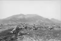 The Australians continued to patrol aggressively, with further clashes occurring between companies from 1 RAR and 3 RAR, and the North Vietnamese. On the morning of 30 May, C Company, 1 RAR under Major Ian Campbell had patrolled into a bunker system 3 kilometres (1.9 mi) east of FSB Coral and was contacted by a large dug-in North Vietnamese force.[97] At 08:30 the lead platoon, 9 Platoon, came under fire and was pinned down by RPGs and 7.62 mm RPD light machine-guns. Meanwhile, 7 Platoon moved to assist but was also pinned down, with one section suffering heavy casualties and losing an M60 machine-gun. Campbell struggled to establish a company defensive position, pushing 8 Platoon forward covered by armed helicopters and indirect fire. Yet with the two forces facing each other at only 10 to 15 metres (11 to 16 yd), the Australian artillery and mortars were rendered ineffective and Dunstan subsequently dispatched two tanks from Coral to reinforce them as heavy fighting developed.[112] Supported by APCs, the Australian infantry and tanks then assaulted and cleared several bunkers, allowing the lead platoon to withdraw after three hours of fighting. Suffering one killed and seven wounded, C Company broke contact by 11:55, withdrawing 500 metres (550 yd) as artillery, mortars and air strikes engaged the bunker system.[113] Three days later C Company returned to the area to recover the lost machine-gun only to find the position as they had left it; strewn with dead bodies and caved-in bunkers with the battlefield having been abandoned by the North Vietnamese, who had also withdrawn following the Australian assault. The tanks had destroyed at least eight bunkers, while North Vietnamese casualties included 24 dead and a further eight believed killed. Another group of 13 had also been engaged in the open by artillery, and were also possibly killed.[114]