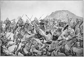 As the remaining Boers mounted their ponies and tried to retreat, two squadrons of British cavalry (from the 5th Lancers and the 5th Dragoon Guards) got among them with lances and sabres, cutting down many. This was one of the few occasions during the Boer war in which a British cavalry charge made contact.[6] Some of the retreating Boers were also killed by the lancers after already clearly surrendering.