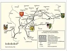 On April 29, 1525, the struggles in and around Frankenhausen had culminated into an open revolt.[1] Large parts of the citizenry joined the uprising, occupied the town hall, and stormed the castle of the Counts of Schwarzburg. In the following days, a rising number of insurgents gathered around the town, and when Müntzer arrived with 300 fighters from Mühlhausen on May 11, several thousand peasants of the surrounding Thuringian and Saxon estates camped in the fields and pastures. Philip of Hesse and his father-in-law George of Saxony had originally targeted Mühlhausen as their strategic objective but, when news arrived that Müntzer left with a troop for Frankenhausen, they changed their march route and directed their Landsknecht troops toward Frankenhausen.[2]