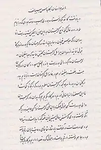 ...You also wrote, six years ago, I gave away the fort of Ganja to the ruler of Russia. This is true, at that time, your ruler wrote letters to all the provinces of Iran and also to us and we accepted the letter and gave the fort. Whenever the king[of Russia] wrote us a decree with regards to Ganja, then make that decree clear so that we may observe that decree and apply it. And you wrote to us "We were a client of Georgia", then know it that right now the letter of your king [the king of Russia] is in our hands and in that letter, you can see that our title was Beglarbegi of Ganja and not a client of Georgia and thus your words are in contradiction with your [own] decree. And the other thing that when we get under the rule of the Russian king, the Iranian king were to Khorasan and we could not reach him, and due to that [fact] the king of Russia is also great, we accepted his obedience, but now, thanks to god, the Iranian king is near and his servant general has come to us and also his army, and more of them will come [to help us]... ...And whenever you seek for a battle, know that we are ready for battle and if you boast about your cannon and guns, thanks to the mercy God, our cannon and guns is no less than yours. And if your cannons are one gaz know that our cannons are three/four gazs and victory is [only] due to God. And how do you know if you are braver than the Qizilbash, you have seen yourself fighting but have not seen the fighting of the Qizilbash. And you have written that to us to be ready for battle. From the time that you came to Shamss al-Dinlu and brought our people under your command, we have been preparing and we are ready for the day of battle if you want to fight. And when you wrote:" If you do not accept our words in this letter then misfortune will strike", we know such thoughts have brought you here. Fate has brought you from Saint Petersburg to that misfortune here. With the will of God, the highest, may your misfortune become apparent.[10] |