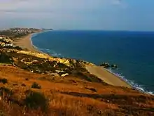 The fishing town of Gela was on a limestone plateau[16] at 150-foot (46 m) elevation behind a beach with a 900-foot (270 m) pier.[17] Plains cultivated for grain extended inland behind the community of 32,000. The mouth of the Gela River was 1 mile (1.6 km) east of the pier and the mouth of the Acate River was 5 miles (8.0 km) east of the Gela River.[18] The sand and stone beach between the rivers was from 10–30 yards (9–27 m) wide and backed by 900 yards (820 m) of dunes.[19] The drainage divide between the two rivers was the 400-foot (120 m) Piano Lupo highland 7 miles (11 km) northeast of Gela with a strategic junction of roads including the coastal highway between Gela and Scoglitti and roads leading inland to Niscemi and Caltagirone.[18]