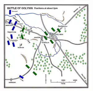 On the morning of 26 December, elements of Golitsyn's 4th Division reached Golymin. They were too exhausted to continue to Makow and Golitsyn also needed to wait for units of Sacken's 3rd Division. In the village he found Dokhturov, who had sent most of his 5th Division towards Makow, but remained at Golymin with a dragoon and an infantry regiment. Golitsyn hoped to rest his men before continuing their retreat.[16]