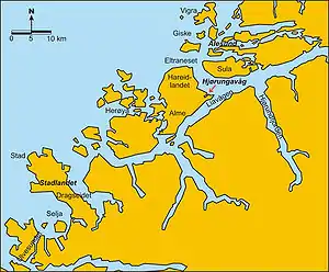 Jómsvíkinga saga offers two mutually contradictory descriptions of the bay on the coast of Sunnmøre in which the battle took place. According to the first one, Hjorungavágr lies on the landward side of the island Hoð (now Hareidlandet in Møre og Romsdal). According to the other, the bay is situated south of an island called Primsigð/Primsignd and north of an island called Horund. Both of these names are not in common use today.[5] [6] [7] [8]