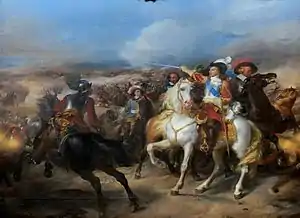 Ligniville's Lorrainers advanced at a trot to meet the French right-wing cavalry under Condé, who were advancing at a walk. Both sides halted at pistol-shot, and neither side made a move for a time. Prior to the battle, Condé was impressed by the fire discipline of the German cavalry who never fired first and used their enemy's helplessness while reloading to charge and rout them.[7] He therefore told his cavalry commanders to hold their fire as well to prevent the Germans from gaining an advantage.[7] The Lorrainers eventually opened fire and killed, wounded or threw from their horse everyone in the French first lines. Condé gave the signal for his squadrons to open fire and then led the Gassion squadron on a charge, crushing the Lorrainer squadron opposite him.[4] Six more French squadrons followed their General's lead and beat the rest of the Lorrainer line.[4] The French cavalry reserve under Erlach came up and enveloped the exposed Lorrainer left, shattering them from the flank.[2]